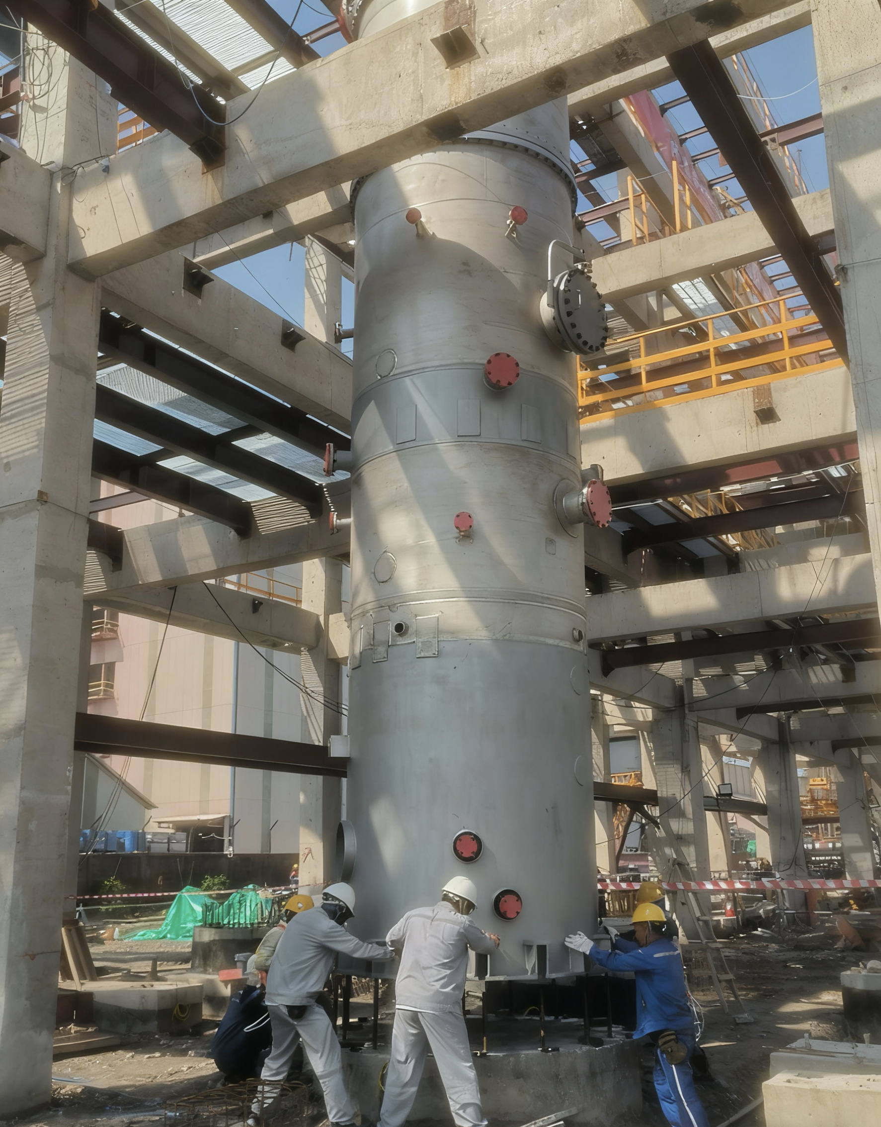 清晨,庞大的设备被运至指定的吊装区域,团队开始卸车作业,并仔细调整设备方向。下午,烈日当空,紫外线强烈,项目部员工们拆开外包装防护,仔细挂绳并尝试吊起,挥汗如雨、衣襟湿透,但他们毫无怨言。在吊装过程中,500吨汽车吊作为主力,80吨履带吊在旁辅助。经过十多分钟的精准操作,设备横跨22米距离,越过19.6米高的框架,最终稳稳落在基础承台上,成功就位。此次吊装为后续设备安装开了个好头,也为国庆佳节增添了亮丽的篇章。