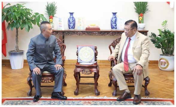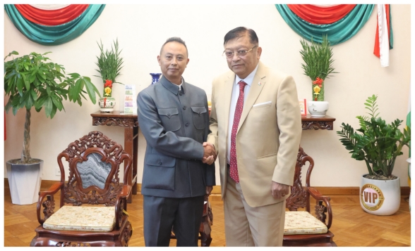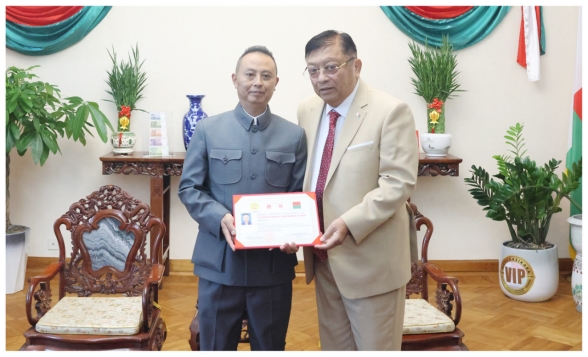 图为:曾现武与马达加斯加共和国驻华大使让·路易·罗班松合影留念