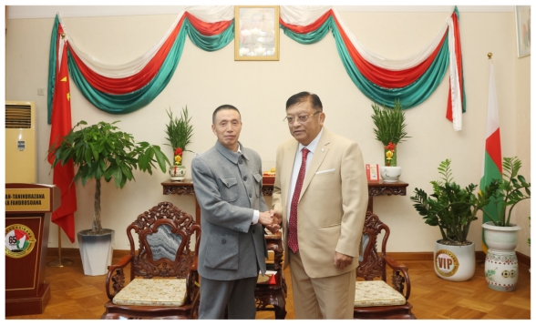 图为:张国位与马达加斯加共和国驻华大使让·路易·罗班松合影留念